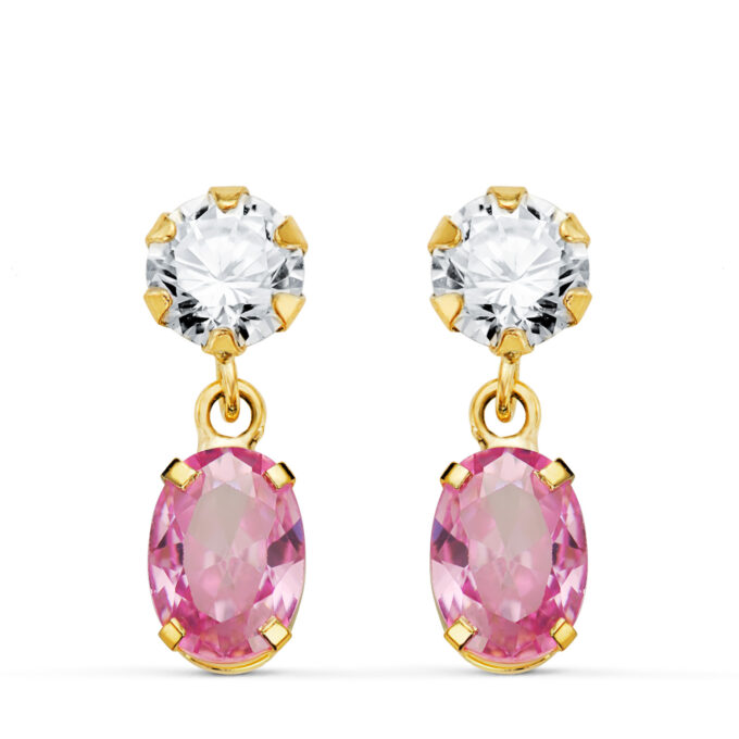 18K PENDIENTES ORO AMARILLO DOS CUERPOS CON CIRCONITA Y PIEDRA ROSA OVAL 16 X 5MM. CIERRE PRESION